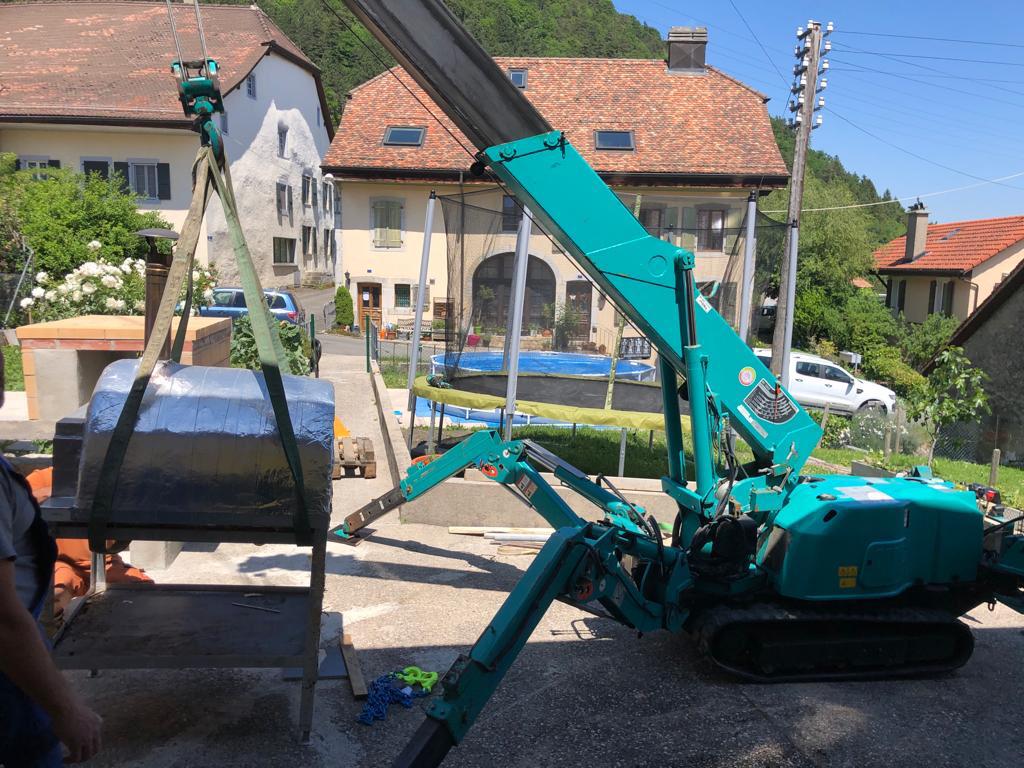 Manutention quelque peu particulière lors de la mise en place d’un four à Pizza pour le compte d’un paysagiste. La particularité de ce chantier était le chemin d’accès large de 90 cm mais long d’une bonne vingtaine de mètres.
