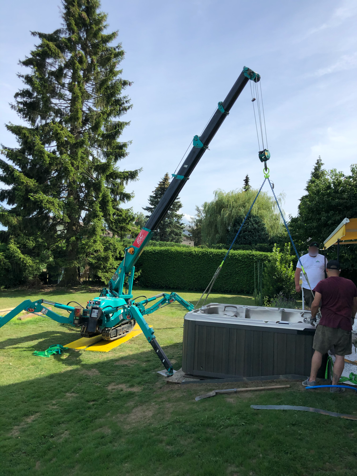 Levage et mise en place d’un SPA sur une dalle de briques.
